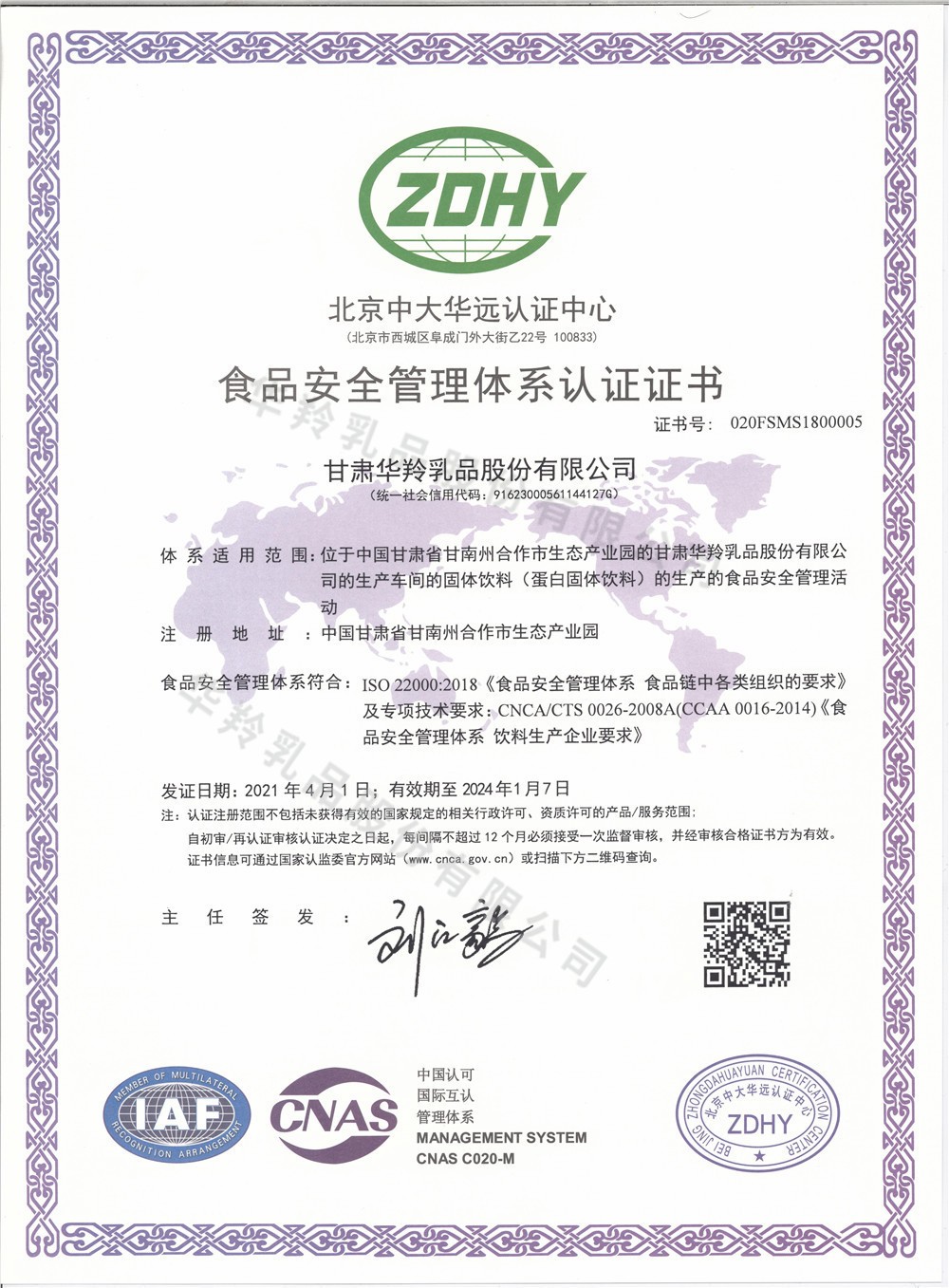 食品安全管理体系认证证书