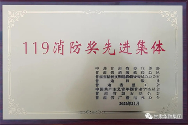 2021年11月9日,由省委宣传部、省消防救援总队、省文明办、甘肃日报社、省总工会、团省委、省妇联和省广电总台联合评选的 “陇原十大忠诚消防卫士”、“陇原十大忠诚消防卫士”提名奖、“陇原十佳消防贤内助”和119消防奖先进集体、先进个人揭晓,甘肃华羚乳品股份有限公司荣获甘肃省“119消防奖先进集体”荣誉称号!