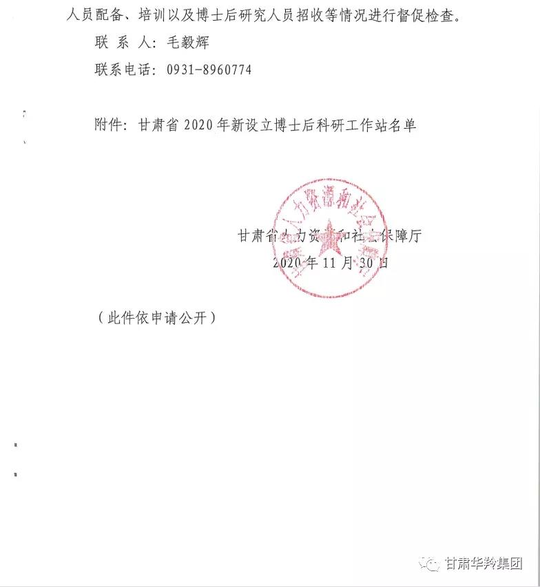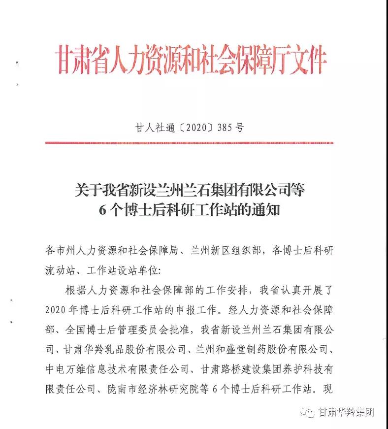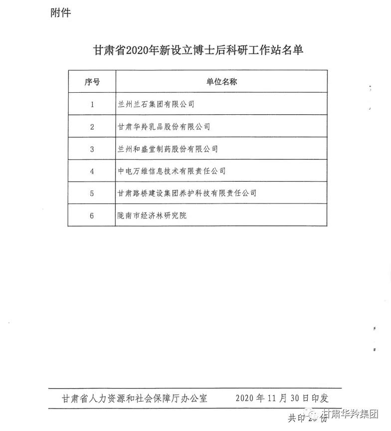 2020年11月30日,经人力资源和社会保障部、全国博士后管理委员会批准,甘肃华羚乳品股份有限公司获准设立国家级博士后科研工作站。