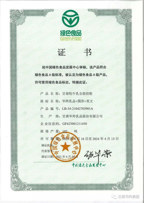近日,甘肃华羚乳品股份有限公司申报的“华羚乳品甘南牦牛乳全脂奶粉”通过中国绿色食品发展中心审核,符合绿色食品A级标准,被认定为绿色食品A级产品,许可使用绿色食品标志,并获准在包装上使用“绿色食品”标志。
